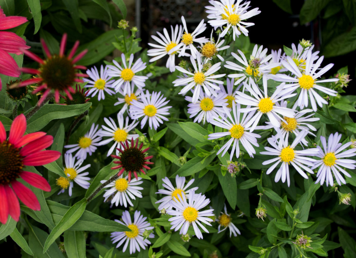 From late summer into autumn, asters are notorious for their showy star-shaped white, pastel purple, violet, or yellow blooms in open fields and mass plantings in gardens. This wildflower is native to our region, and pollinators love them. Plant in an area that receives full to partial sun and has well-draining soil.